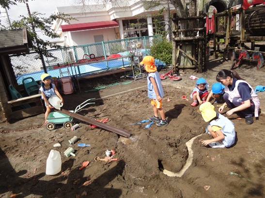 園庭の砂場で遊びました。 大きな山の中にトンネルが貫通したことで、川を作ったり池を作ったりして、水遊びを楽しみました。 &nb...