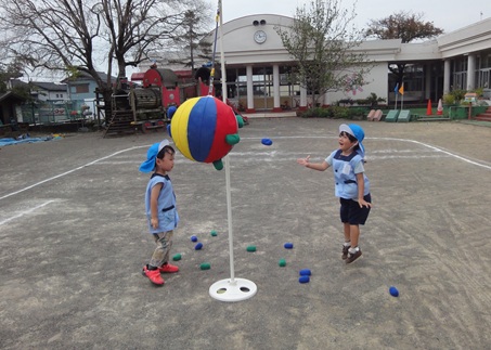 運動会に向けて初めて玉あてをやってみました。ボールが的に当たると「できた!」と喜んでいました。教師が「もう1回やってみる?」と聞いてみると「...