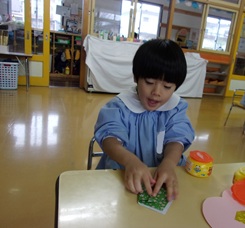 ひなまつり製作を行いました。好きな折り紙を選んで、お内裏様とお雛様の服を作りました。教師と共に折り紙を楽しんだり、完成した服をお人形に貼った...