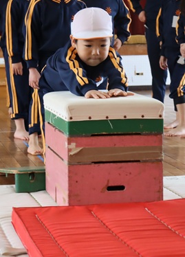 今日の体操は、跳び箱をしました。 最初は、手の位置や足を広げるという跳び箱の方法を確認しました。 その後に、飛び箱を飛び越えようと取り組む子...
