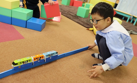 ホームクラスでは、線路にモノレールを走らせたり、ブロックを積んだりしながら楽しそうに遊んでいる子ども達です。 &...