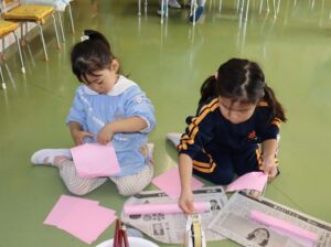 年下の友達も年長の友達が行っている姿を真似しながら友達や先生と一緒に作ることを楽しんでいました。