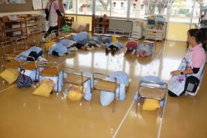シェイクアウト訓練では、放送を聞いて防災頭巾を被り約1分間動かず揺れがおさまることを待つ訓練をしました。