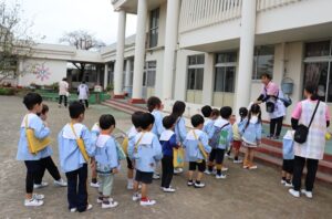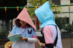 また、防火訓練では防災頭巾を被り、ハンカチで口をおさえて園庭に避難しました。