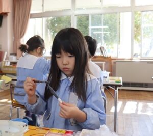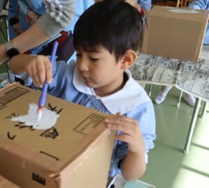 アート展に向けて個人製作をしています。年中、年長は自分の絵の具を使い、ペットショップの動物の部屋やお弁当を食べるのに必要な食器を楽しそうに塗っていました。