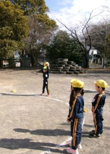 今日はボールを投げたり、取ったりする活動をしました。ボールを投げる時は、頭の上から友達に向かって投げることを知り、何度も行う姿がありました。