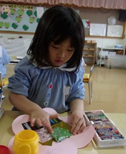 ひなまつり製作を行いました。好きな折り紙を選んで、お内裏様とお雛様の服を作りました。教師と共に折り紙を楽しんだり、完成した服をお人形に貼ったりしました。