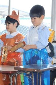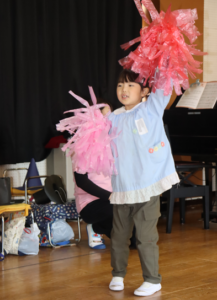 ホールで劇やダンス、歌をうたい、最後の表現発表会を友達と楽しむ姿が見られました。