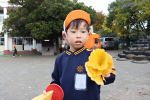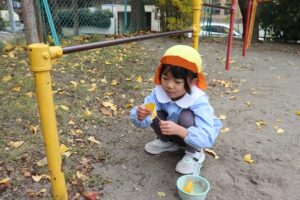 イチョウの葉が黄色になったことに気が付き、落ちている葉をたくさん拾っていました。