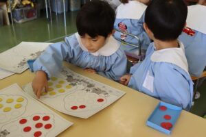 じゃんけんをして勝ったらおはじきを置き、どちらの方が多い?少ない?を確かめてみました。