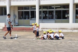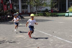 白い線の中に入らないことや、友達を押さないことを確認して、約束を守りながら走る姿がありました。