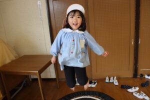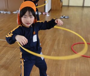 今日は雨天のため、ホールでトランポリンやフラフープなどで遊ぶことを楽しんでいました。