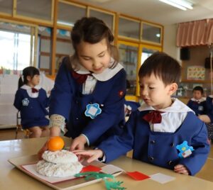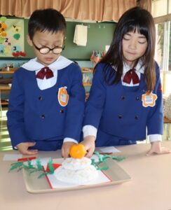 今日は、終業式でした。園長先生の話から、早寝早起きや冬探しなど、冬休みの過ごし方を聞きました。また、部屋で鏡餅を触り、「冷たい」「固くなってる」と感じたことを話していました。