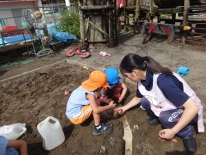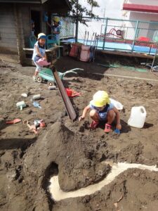 大きな山の中にトンネルが貫通したことで、川を作ったり池を作ったりして、水遊びを楽しみました。