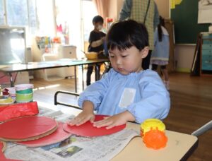 年上、年下の友達が一緒に製作を行い、のりやハサミを使うことを楽しむ姿が見られました。