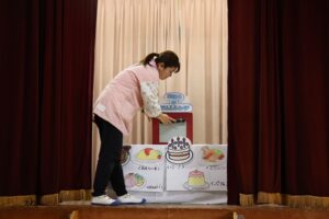 先生たちの催し物は『魔法の電子レンジ』でした。電子レンジから食べ物がでると「すごーい」と大喜びでした。
