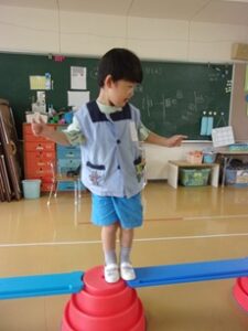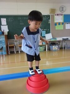 今日は雪組で、運動会で使うビルドインバランスで遊びました。「カニになってみよう」と教師が話し、手をカニにして落ちないように歩きました。ダンスで使うお面も、クレヨンで好きな色で塗って作る姿がありました。