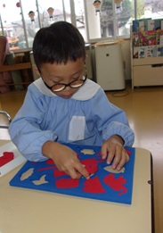 ピアジェブロックで遊びました。教師が好きな食べ物を聞くと、ブロックの中から選び、「キノコあった」「アイス」とブロックを取り出していました。シートにかくれんぼしているブロックの形を見つけ、シルエットの上に置き、「ぞうさんいた」「できたよ」などと話していました。