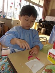 アート展の個人製作では、ドングリ人形と遊具を作ってみることにしました。教師の作った滑り台などでドングリを転がして遊んだ後に、「やってみたい」と話す子ども達が教師と一緒にドングリ人形や遊具を作りました。ボンドを使ってモールをドングリに付けたり、お花紙や画用紙を紙皿や牛乳パックに貼ったりしました。