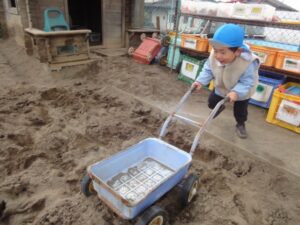 今日は、外遊びに行きました。友達と遊具に乗ることを楽しんだり、砂場で一輪車を押すことを楽しんだりする子ども達でした。