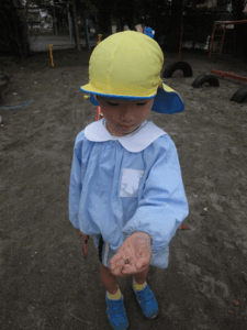 シャベルで土を掘って虫を探す姿や、見つけた幼虫を先生に見せる姿がありました。