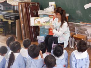 「木からどんぐりが落ちてきた」や「寝ているところ」と描いた絵の内容を教えてくれました。