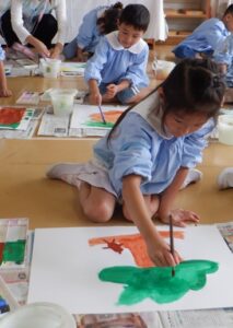 『どんぐりむら』の絵本を見た後にどんぐり何して遊んでいる?をテーマに絵を描きました。