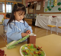 アート展製作を行いました。 お花紙でお肉を作ったり、ダンボールに絵の具を塗っておぼんを作ったりしました。 友達と一緒に作ることを楽しんでいま...