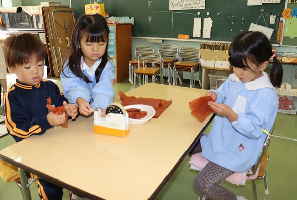 柿の木にたくさんの柿ができました。 子ども達は先生と一緒に収穫をし、お弁当の時間に食べ「おいしい」と話していました。 お家に持って帰っていま...