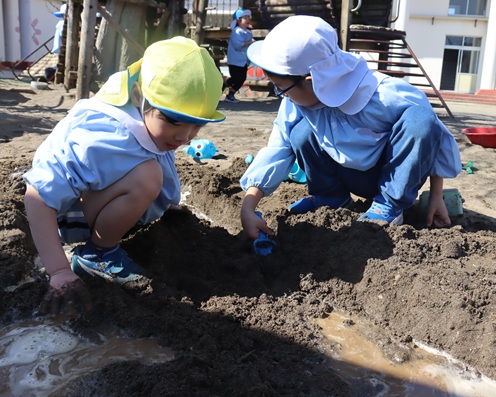 天気が良く、暖かかったため、子ども達は砂場で川作りをしていました。 水の通る道を作る人、水を運ぶ人など年長児が年下の友達に声を掛けながら遊ん...